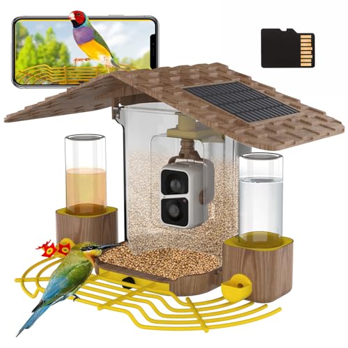 Patent Design: This is the only bird feeder equipped with a camera, featuring a 1.5L bird food area, a 0.35L water basin, and a 0.35L hummingbird feeder designed to attract a variety of bird species. It boasts a multi-function bird camera with photo and video capabilities, two-way dialogue, lighting, night vision, an alarm function, instant notifications, an included SD card, and AI identification.