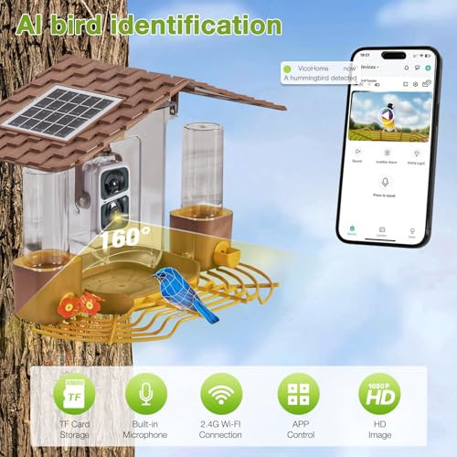 High-Definition Camera: Equipped with a 160° wide-angle lens and 1080P High resolution, this bird feeder camera ensures you get the best shots of images and videos in vibrant color, even at night. You can see birds clearly from a selfie-like perspective and capture close-up details like their feathers with 3X magnification. Plus, the built-in two-way audio feature lets you listen to birdsong while also using the microphone to deter squirrels and other animals.