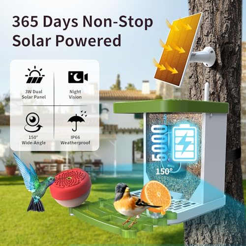 Recognition Smart Bird Feeder with Camera - This bird feeder with a camera automatically captures and recognizes more than 16,000 species of birds and notifies you of their arrival in second.(Subscription Required; 30 days Free Trial) It takes you to explore the wonders of the bird world. With the bird feeder, you can know more about recognized birds while enriching your spare time.