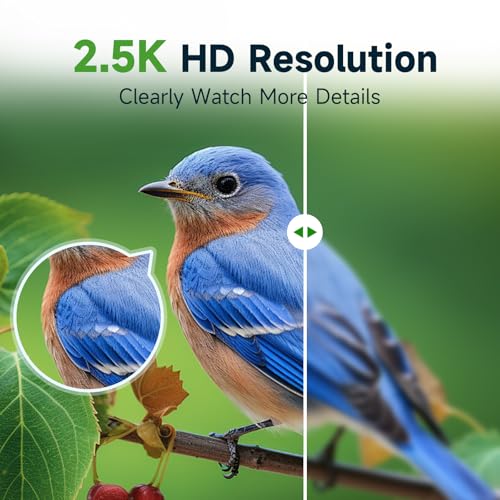 Full 2.5K HD Resolution with 150° Wide Angle - Enjoy the beauty of the bird world with a 150° wide-angle camera and its stunning 2560*1440 Full HD resolution. Built-in night vision and magnification allow you to capture the behavior and details of your avian visitors with crystal-clear vision, day or night(Please fully charge the camera before using it for the first time)