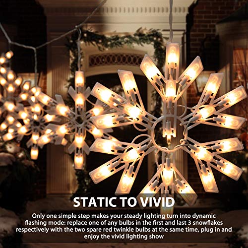 ? Steady and Dynamic Flashing Mode ?- One simple step makes steady lighting turn into dynamic flashing mode: replace one of any bulbs in the first and last 3 snowflakes respectively with the two spare red twinkle bulbs at the same time, plug in and enjoy the vivid lighting show.