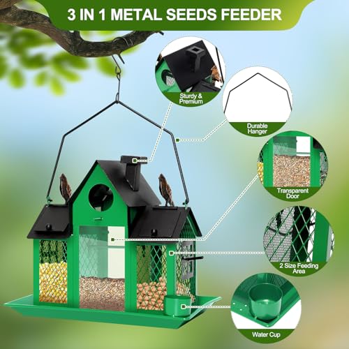 ?????Large Capacity & Efficient Drainage?Our bird feeder has a capacity of 7 pounds, eliminating the need for frequent additions and providing an ample food source for birds. It's designed with care and comfort in mind, including drainage holes, ventilation holes, and drinking cups, ensuring that the seeds are always dry and fresh, making your garden a favorite place for birds to go.