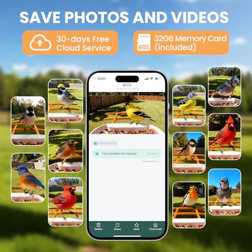 Perfect Gifts for Birding and Bird Lovers: The Soliom bird feeder camera wireless outdoor will record videos of birds and store them in the cloud. (one-month trial for new users) which can be extended through a subscription or by using a larger memory card ( 32GB memory card included). Share these lovely moments with friends and family!