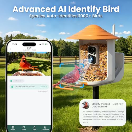 Advanced AI Recognition 11000+ Bird Species: The bird camera won't let you waste time checking the Internet to see what kind of bird you've photographed. The AI bird feeder camera comes with the most advanced bird recognition algorithm, providing you with exciting wildlife education. (One-month AI recognition trial. Basic Cloud service subscription needed for the Birds AI service.)