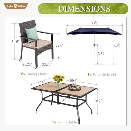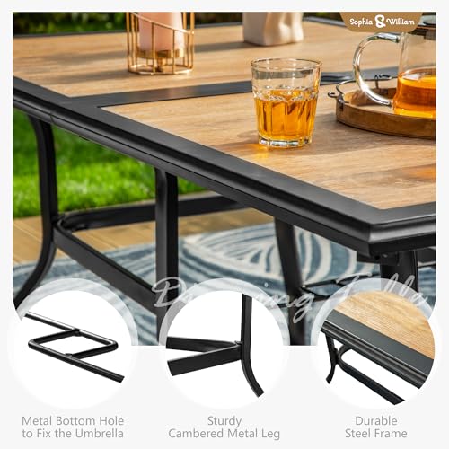 Outdoor Table: L 59.6 X W 37.2 X H 28.7 , umbrella hole: 1.62. Spacious and comfortable for 6 person familys dinner and party. Ecoating metal steel frame ensures the longevity of this outdoor dining table. Rust and weather resistant, brings you years of enjoyment, easy to assemble by 1 person in 40 minutes