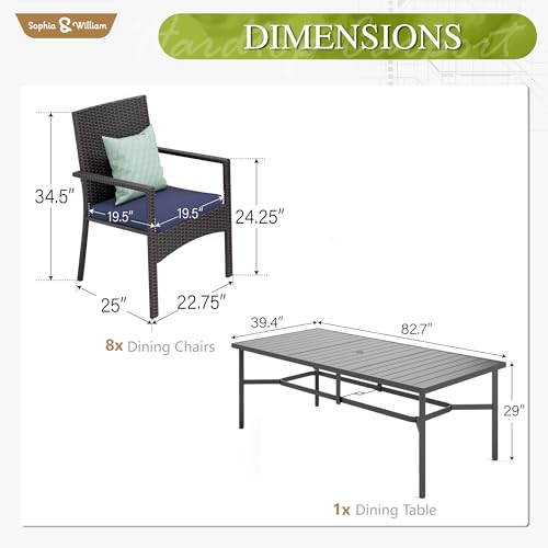 8-Person Outdoor Dining Table: Black iron 82.7" dining table, designed to comfortably seat 8 guests. Table Size: 82.7" x 39.3" x 29"H. With 1.9" umbrella hole, you can easily add shade for sunny days, making every meal feel special