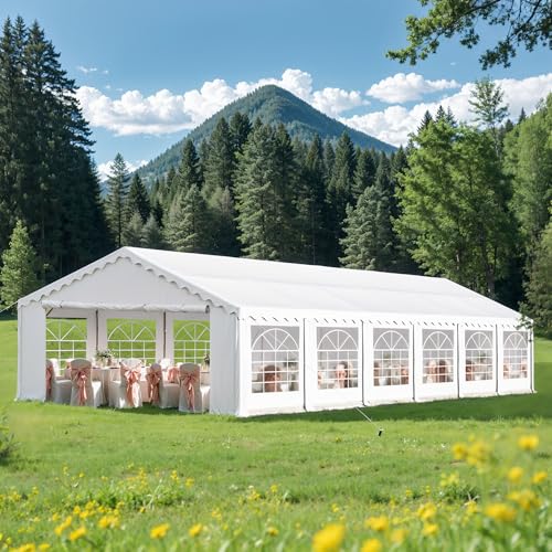 Premium Party Tent: 180G PE roof cover and sidewalls - 100% Water repellent & 99% UV protective. 30% Thicker and stronger galvanized steel tubes combined with ground pegs and reinforced guy ropes ensure the safety and stability of the party tent for long time use