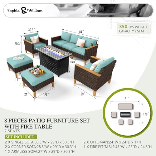 WICKER PATIO FURNITURE SET:This patio furniture set includes 2 x corner sofa, 2 x single sofa, 1 x armless sofa, 2 x ottomans and 1 x 45" fire pit table, provide a spacious space for at least 7 persons to enjoy ample warmth and a romantic bonfire atmosphere. This practical patio conversation set is the perfect addition to your outdoor space, Whether youre enjoying a peaceful moment alone or hosting a gathering with friends, this sofa ensures that comfort is never compromised.