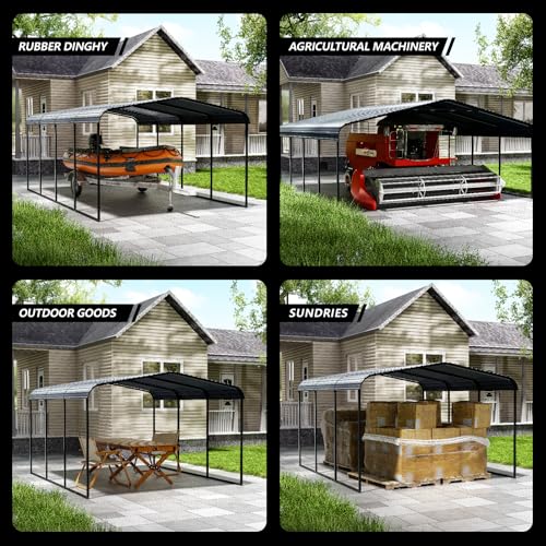 Heavy-Duty Outdoor Metal Carport?Upgraded from traditional fabric covers, our heavy duty carport features a galvanized steel roof and powder-coated tube frame. This rust-resistant, sturdy design withstands all weather conditions, making it perfect for sheds & outdoor storage.