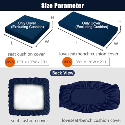 Package: 3 packs outdoor cushion slipcovers (1 pack -loveseat/bench cushion covers: 38"Lx19"Wx2"H), 2 packs-single sofa/chair cushion cover: 19"Lx19"Wx2"H), COVER ONLY
