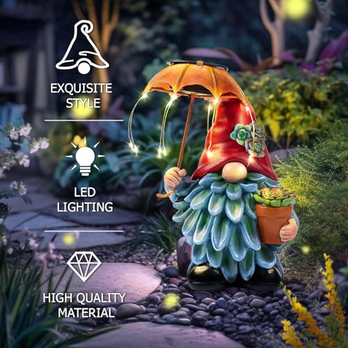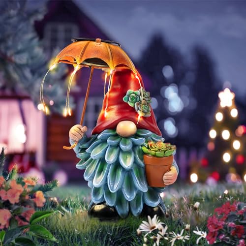 Captivating Garden Statues Designs: Illuminate your garden with this charming solar gnome statues featuring a whimsical gnome cradling a pot of succulents and an umbrella adorned with delicate lights. Watch it come to life as night falls, casting a warm and enchanting glow throughout your garden