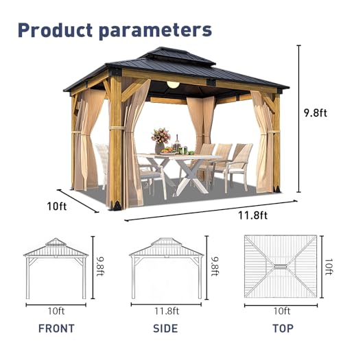 - SPACIOUS DESIGN: Our high quality material wooden gazebo has a spacious layout, and the size of 10*12Ft. can provide you with plenty of space for relaxation and entertainment. Whether you're gathering with friends or seeking a peaceful retreat in your backyard, the spacious interior provides the perfect setting for any occasion.