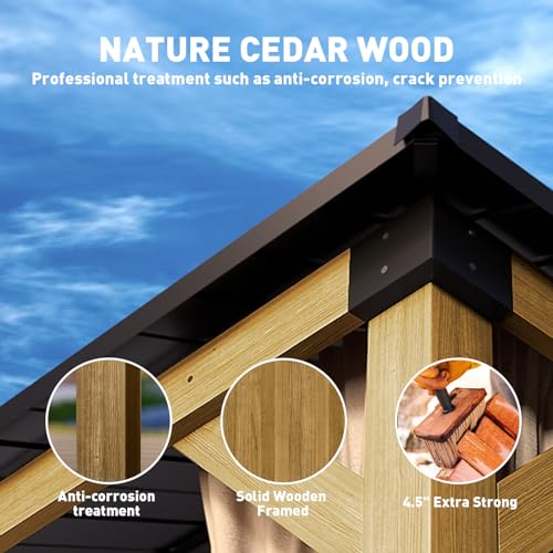 - PREMIUM QUALITY MATERIALS: Our Outdoor Wood Gazebo for Patio is crafted from premium cedar wood and coated metal roofing with a beautiful wood grain finish that combines beauty and elegance with durability. Invest in a durable outdoor structure that will enhance your outdoor living experience for years to come.