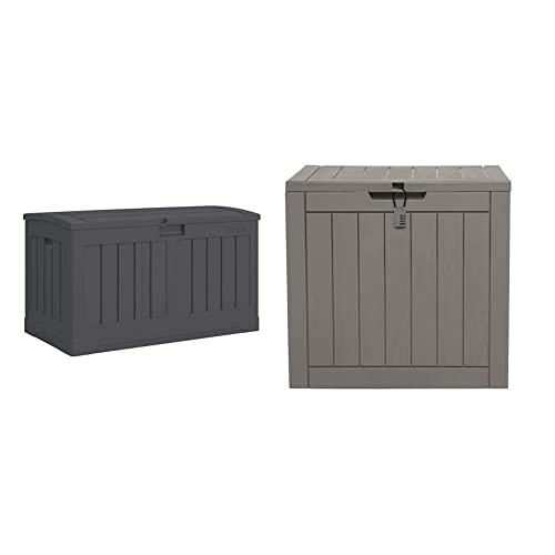 Spacious 50-gallon patio deck storage box with molded lock fit for storing outdoor essentials from gardening tools to cushions. It has a durable resin composition and all-weather construction. (Suncast)