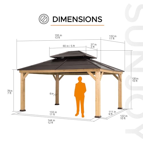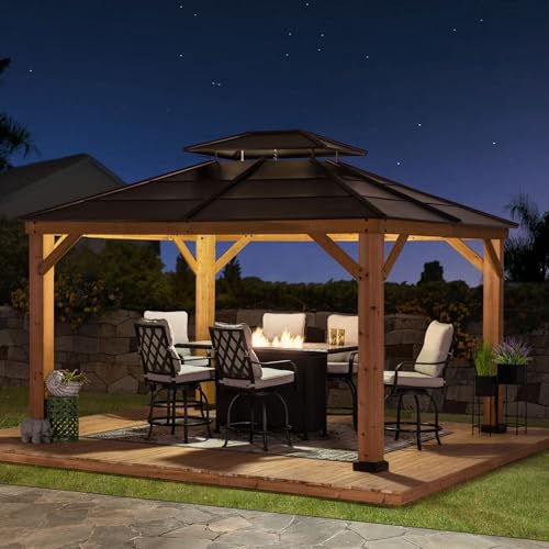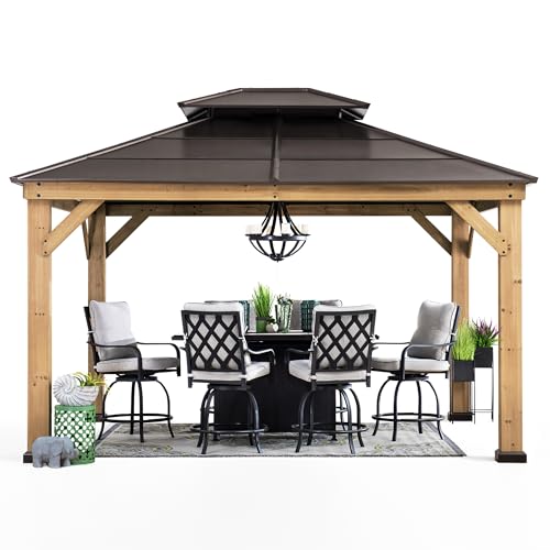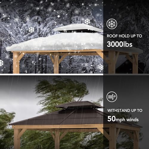 ?Stability, Protection & Privacy?- Featuring a durable brown, 2-tier steel roof and premium cedar wood frame, this gazebo not only provides shade and comfort from the heat, but also keeps the water out. Built-in dual rail system allows you to suspend mosquito netting and privacy curtains (mosquito netting and curtains sold separately).