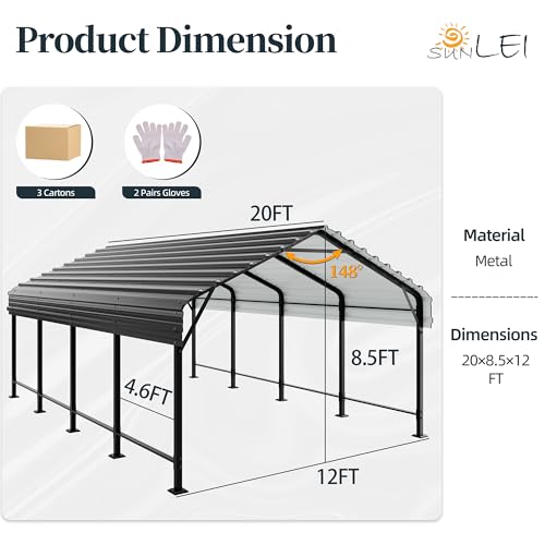 ?Upgrade Sturdy Frame?This upgraded 12'x20' carport features a galvanized steel roof and powder-coated steel frame, the galvanized steel roof is rust-resistant, ensuring excellent durability and stability in all weather conditions, protecting your outdoor tools and vehicles from the elements.
