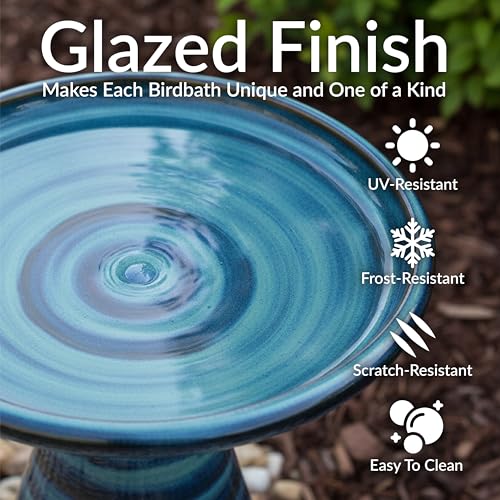 Strong and sturdy: This outdoor bird bath is made from durable clay with a mineral glaze finish for long-lasting beauty. This bird bath is resistant to weather, UV rays, and frost. Please note, variations in color may occur due to manual glazing and the unique kiln firing process.