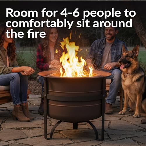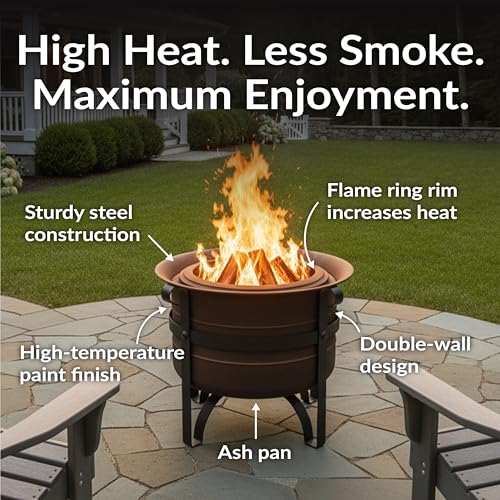 Double-wall design for reduced smoke: This smokeless wood fire pit features a double-wall design with bottom vent holes to reduce smoke and allow the bonfire to burn more efficiently. The venting allows oxygen to enter the body of the fire pit, burning away small wood particles that could become smoke.