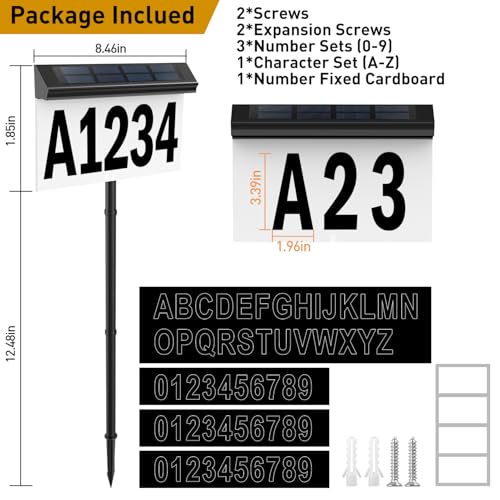 ?Solar Address Number Sign? The solar address sign outside comes with 3 sets of numbers (0-9) and 1 set of letters (A-Z),1 number fixed cardboard for easier to place your house numbers. Large peel and stick numbers and letters can accommodate any address up to 4 digits. House number sign for yard also came with a spacing template that simply lays over the opening and allows you to properly space and positions your 4 digits