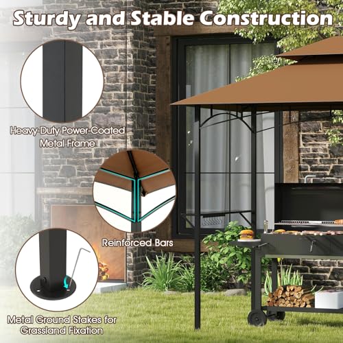 Tangkula 8x5 Ft Grill Gazebo, 2-Tier Barbecue Gazebo with 2 Shelves, 7 Hooks, Metal Frame, Outdoor Grill Canopy for Backyard Garden Poolside (Coffee)