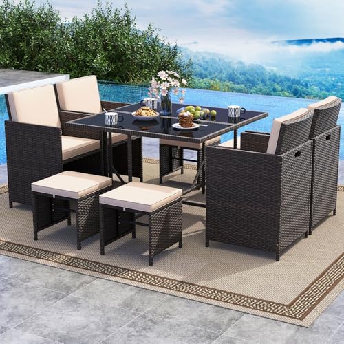Ultimate Comfort Design: The patio dining set has 4 back cushions, 4 seat cushions, and 4 ottoman cushions, all of which are filled with high-density sponge and easily removable for easy maintenance. Additionally, each chair has an inclined backrest and cozy armrests, ensuring your guests enjoy hours of comfort during gatherings.
