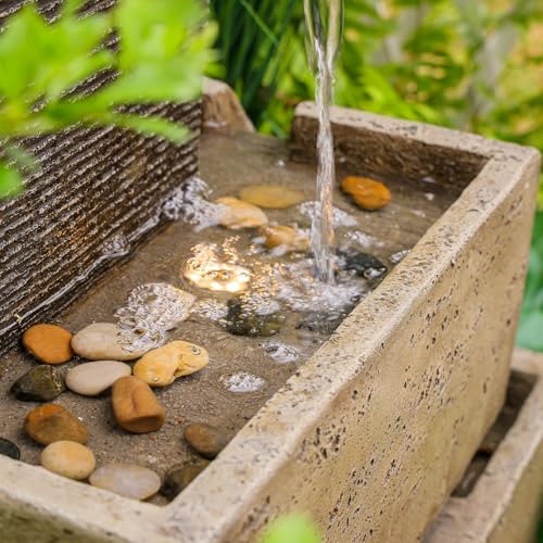 EXQUISITE OUTDOOR FOUNTAINS - This patio rustic elegance Cube Fountain, a versatile masterpiece designed for both outdoor and indoor spaces. With two neatly arranged spouts accompanied by gentle lighting, this fountain seamlessly blends sophistication with tranquility.