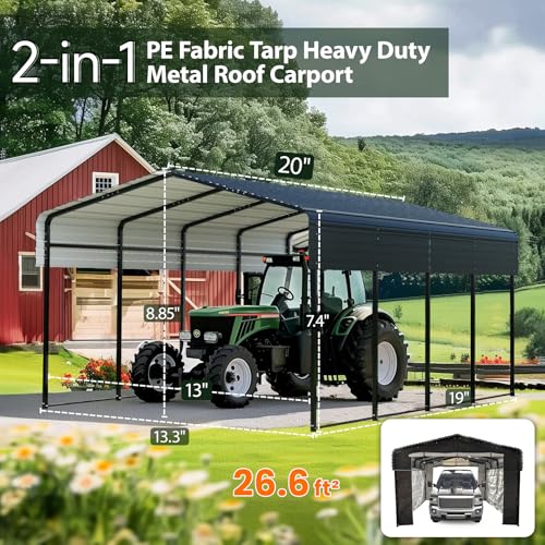 ?Quality Performance?Steel carport canopy has UPF50+ UV blocking ability, can withstand 100 mph winds and 35 PSF of snow. The slanted roof of the carport canopy is equipped with upgraded high-density rain tape to minimise the risk of rainwater leakage.