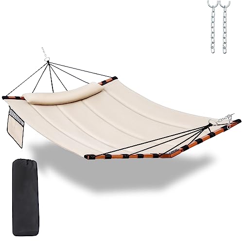 ?Super Large Hammock: 55in width x 79in length large hammock bed can easily accommodate 2 people to enjoy the leisure time simultaneously (maximum 450lb capacity). The pillow is lengthened to 35.4in for two people. Besides, the hammock comes with a detachable side pocket for phone, books, cups and other stuffs for your convenience.