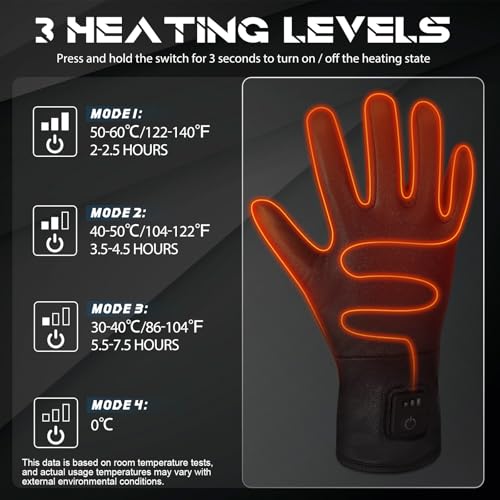 Built-in Heating Elements: Heating covers the back of the hand and fingers for optimal warmth. Features 3 heat settings (High/Medium/Low), with a maximum temperature of 150°F. Press the button to adjust heat; long press for 2 seconds to turn on/off.