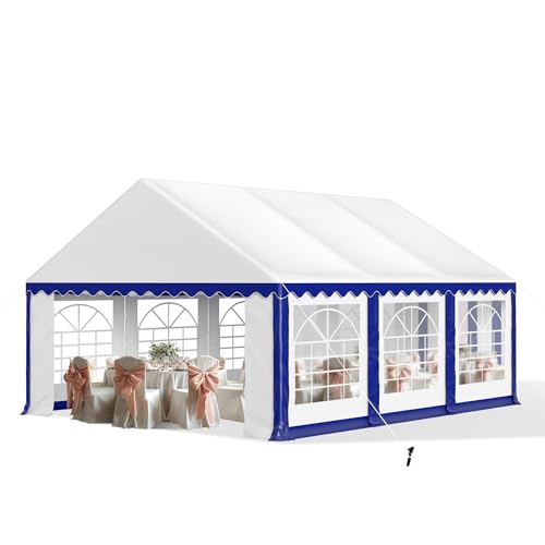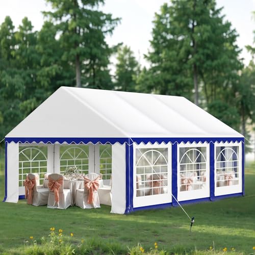 Premium Party Tent: 180G PE roof cover and sidewalls - 100% Water repellent & 99% UV protective. 30% Thicker and stronger galvanized steel tubes combined with ground pegs and reinforced guy ropes ensure the safety and stability of the party tent for long time use