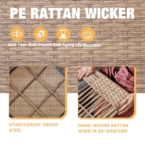 WICKER PATIO FURNITURE SET: Handwoven from dense, all-weather rattan and reinforced with a powder-coated steel frame, this outdoor furniture set withstands harsh sunlight, rain, and extreme temperatures without cracking, sagging, or fading. Its low-maintenance design and timeless natural finish effortlessly elevate outdoor spaces.
