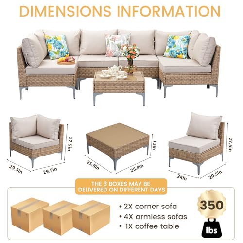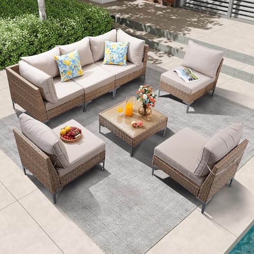 MODULAR OUTDOOR SECTIONALS: The patio furniture set includes 2 corner chairs, 2 armless chairs, and 1 glass-top coffee table that offer flexibility and many layout combinations. You can set it up in all kinds of ways to fit your scene. The modern design comes with high legs, making it visually appealing and easy to clean.