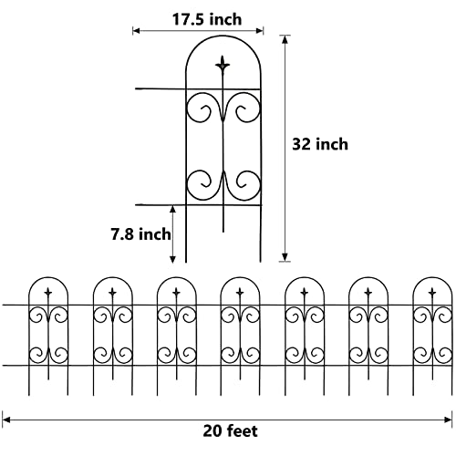 ?Size & Rustproof Material??This metal garden fence measures 20 ft wide x 32 in high,This wrought iron fence is made of high quality metal material and durable powder-coated finish helps prevent rusting and stands the test of time and weather. Iron, rust and corrosion resistant, sturdy and durable for years of outdoor use.