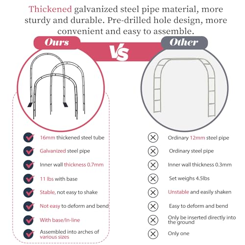 STURDY MATERIAL: Made of better quality; tougher and rust-proof galvanized steel tubes. The inner wall of the steel pipe is thickened to 0.5 mm; which is twice as heavy as the ordinary products and not easy to bend; deform and tilt. Can be used for wedding arch; garden arch trellis; garden arbor