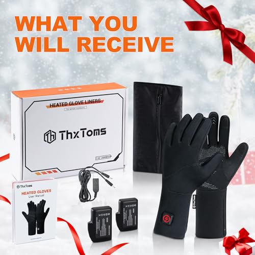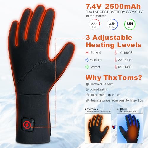 ?Rapid Heating & Customizable Temperature?The ThxToms rechargeable heated glove liners come equipped with advanced 7.4V 2500mAh batteries that heat up in just 10 seconds. With three adjustable heat settings, they deliver consistent warmth and comfort for all your winter adventures. The LED indicators on the top button make it simple to see which heat level is currently selected.