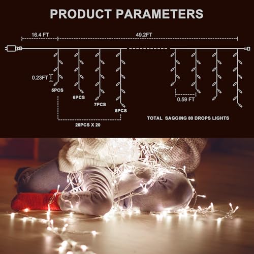Upgraded Christmas Icicle Lights:520 LEDs with 80 drops, 49.2ft long16.4ft extension cord. This fairy lights sufficient to cover most windows and walls for a larger light display.