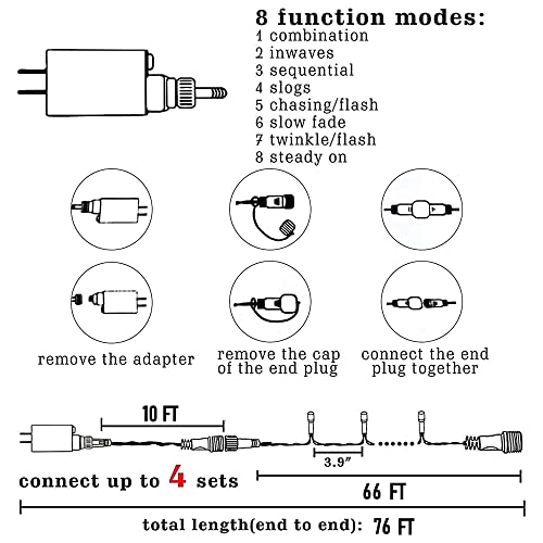 8 Lighting Modes: There are 8 different lighting modes: combination, slow glow, wave, sequential, chasing/flash, slow fade, twinkle/flash, and steady on. Press the button on the transformer to adjust the mode that you like.