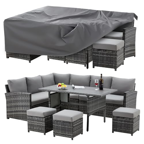 ?HEAVY-DUTY MATERIAL?Our outdoor sectional furniture set is made of 600D upgraded Oxford fabric. The heavy duty material helps the cover have a good performance in water proof and crease resistance. What's more, the premium sealing side makes the rectangle cover become durable. You don't have to worry about the cracking problem when leaving it outside.