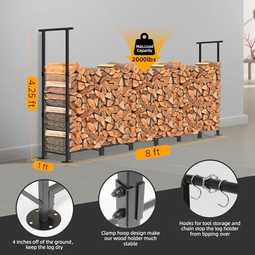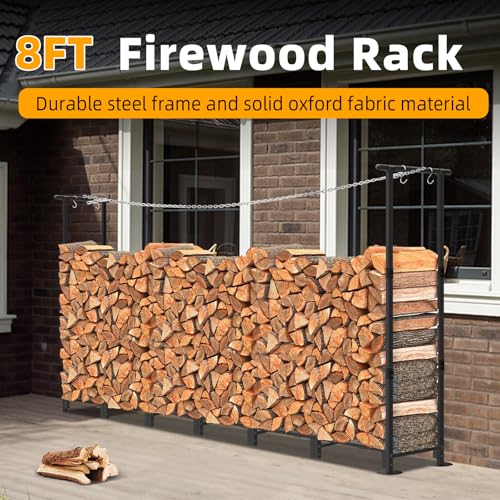 High Capacity Storage and Wide Range of Application: The firewood rack measures 8.0 W x 1.0 D x 4.25 H ft, holds up to a face cord of firewood, the length can be adjusted to fit on living room,backyard,outside fire pits, porch, garden, deck, patio, shed