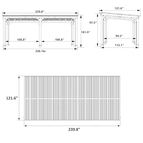 Dimensions - Over size: 239.8"L x 121.6"W x 101.9"H; Internal size: 236.1"L x 112.1"W x 97.5"H. Please note that the gazebo is shipped in 6 boxes and may arrive at different times