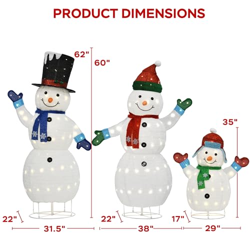 Meet the Snowman Family - Papa, Mama & Baby! Welcome this charming snowman trio to your holiday decor! Standing at an impressive 62", 60" and 35", their soft white plush bodies and warm LED glow will fill your heart with Christmas joy and transform your space into a winter wonderland.