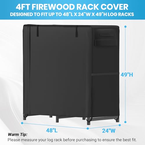 ?4 Feet Wood Rack Cover?Cover measures 48"(L) x 24"(W) x 49"(H), suitable for a 8ft log rack, package include a storage bag. Please confirm the size of your log rack before purchase this wood holder cover.