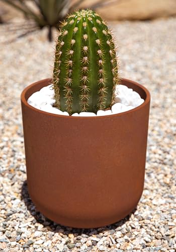 PATENTED MATERIAL: This round planter, made from a patented blend of steel and plastic, arrives in a partially rusted state. It’s also lightweight, weatherproof, and durable.