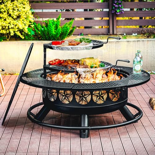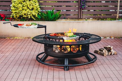 ?Double the Grilling Power?Verdeluxe heavy duty large firepits for outside equipped with two cast iron grills (18" + 21" diameters), let you cook simultaneously,Sear steaks on the large grill while toasting vegetables on the smaller one.Position foods closer or farther from flames using dual zones.The firepit with grill weighs 35 lbs,you can move it around to wherever you want to enjoy a comfortable fire.