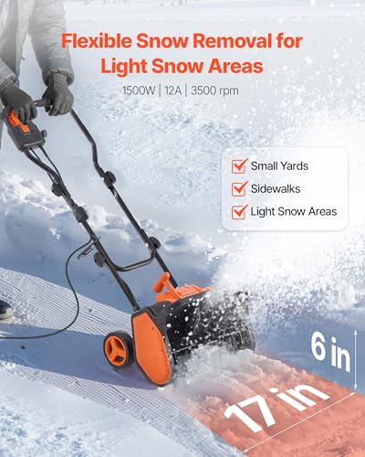 Compact and Maneuverable: Powered by a stable 12A, 1500W motor, this electric snow shovel clears a 17-inch wide and 6-inch deep path in one pass. Its lightweight design easily navigates tight spaces, making it ideal for light snow regions.