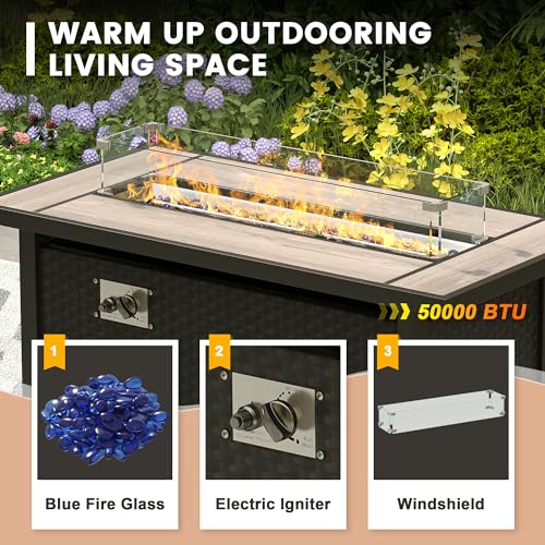 ?2 IN 1 Fire Table?The 50,000 BTU heat output ceramic top fire pit table can warm up your outdoor living space and create romantic bonfire atmosphere. Extra wind guard better blocks breezes that compromise your fire to maintain a more steady flame. It can be easily transformed into a coffee table by closing the fire lid.