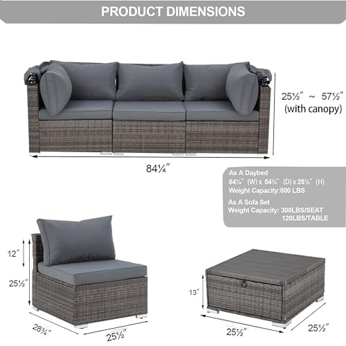 Outdoor Sectional Sofa Set: Transform the rattan daybed into a 6-piece patio conversation sofa set within minutes. The set includes 2 armless sofas, 1 tea table, 1 3-seat sofa with a canopy, 6 cushions, and 7 pillows.