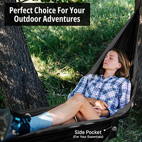 Packable and Convenient: This heavy duty hammock comes with an attached bag for easy portability, and a small pocket that's perfect for storing your phone, wallet, or water bottle while you enjoy your time in the hammock. The hammock and bag together weigh only 1.5 pounds, making it perfect for travel or camping. The hammock measures at 108 inches long by 54 inches wide, which gives enough room for a single person plus a pet. Lay back and enjoy the ultimate camping experience.