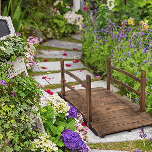? [Decorative Bridge] Carbonized finished fir wood makes it a beautiful and rustic landscaping to your koi pond, dry creek bed, garden pathway or rustic wedding. The assembled size is L48.4*W26.8*H18.4". The size is perfect for your small garden. ? [Solid Construction] Additional 3 wood boards reinforced the bottom, which make wood bridge more stable. Max weight capacity up to 400 lbs. ? [Secure Design] There are railings on each side of the arch walkway garden bridge which not only add aesthetics but also safety. When you kids are playing on the bridge, you would not be worried about the safety. ? [Long-lasting Material] Weather-resistant durable fir wood construction prevents rot, cracking, and splitting, higher quality ensures longer product life time. ? [Simple and Fun Assembly] Package included the instruction and hardware. Please patiently invite your friends or families to join this activity. Electric Drill is highly recommended!