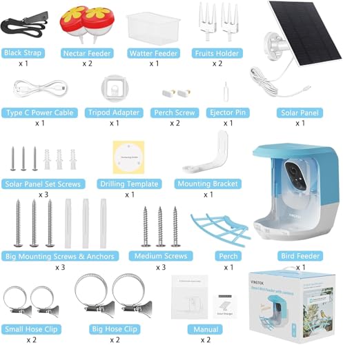 Aesthetics & Bird Friendly Design: The smart birds feeder crafted from premium materials. IP65 Waterproof ,there’re drainage holes on the feeder top and bottom, so if it rains the seeds won't be sitting in a puddle of water.This camera bird feeder features a 1.2L Bird Seed Container,Fruits Forks*2?Nectar Feeder *2, Water Feeder *1. You could DIY birds food to attract hummingbirds, orioles, blue jay and other birds
